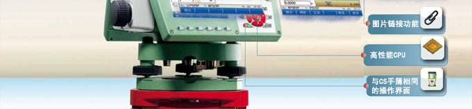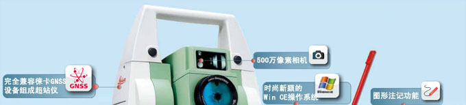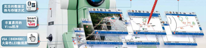 Win CE 6.0版操作系统 通用Windows操作系统,符合用户使用习惯。 您将能享受: 浏览网页;Word PAD文本编辑;Windows方式的数据管理/下载。 Viva程序 在电力、地铁、水利水电、大坝、高铁、测绘等众多行业,VivaTS11i/15i都有相应程序软件和本地化解决方案供您选择。 您将能享受:丰富易用的Viva程序—— 一款仪器在手,测量行业不愁。 数码相机 500万像素相机。 您将能享受:即时取景,实时图片记录测量现场,真实的图像语言让您运筹帷幄。 注记功能 点位、建筑物关系等现场信息可以随手注记在照片或草图平板上,省去记录板记录的繁琐。 您将能享受:测量、建筑物关系记录一人完成,节省劳动力投入。 链接功能 照片信息随手链接到对应目标,图像名称包含点号、日期、测量时间。 您将能享受:直接看出点号与图像关系,省去内业整理的繁杂,测量更直观省力。 | 高性能CPU 全新CPU(532MHz),比TPS1200+(233MHz)快一倍以上。 您将能享受:更快的CPU, 让您体验更顺畅的仪器反应速度,提高了作业效率。 数据交换与存储方式 内存、SD卡及U盘的多种存储方式并存和数据线、蓝牙、USB等多种交换方式共用。 您将能享受:多种存储方式、多种连接方式自由选择,避免现场条件限制而影响作业。 VGA彩色触屏 唯一采用FULL VGA(640×480)大彩色LED触摸屏的全站仪。 您将能享受:更强的层次感,更丰富、更清晰的色彩显示,确保操作准确无误。 操作手簿 Viva全站仪可以连接CS10/15手簿,用手簿控制全站仪操作。 您将能享受:诸如组合成单人测量系统、镜站仪等更多时尚高效的测量模式。 兼容徕卡GNSS设备组成超站仪 无需布设控制网,颠覆了"先控制后碎步",复杂而且工作效率低的测量模式。 您将能享受:直接进入碎步测量,简便易行,大大提高作业效率。 |